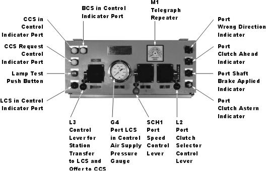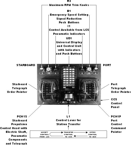 The control system is primarily a pneumatic control system. The pneumatic control signals originate from two PCH-VAA-EST electric shaft control heads in the Central Control Station console. When in Bridge Control Station control, the control heads are electrically driven from the dual lever electric control head in the Bridge Control Station.